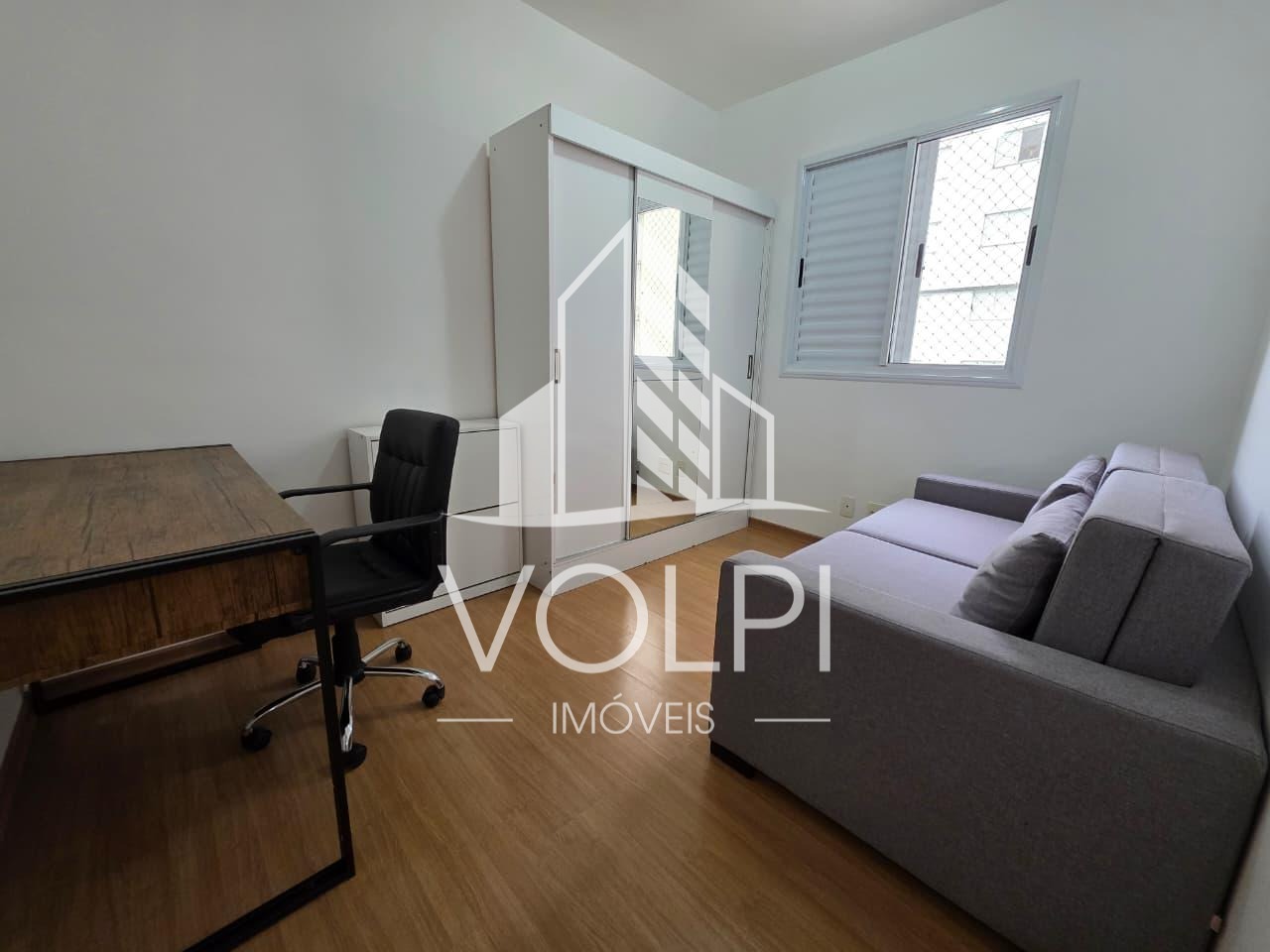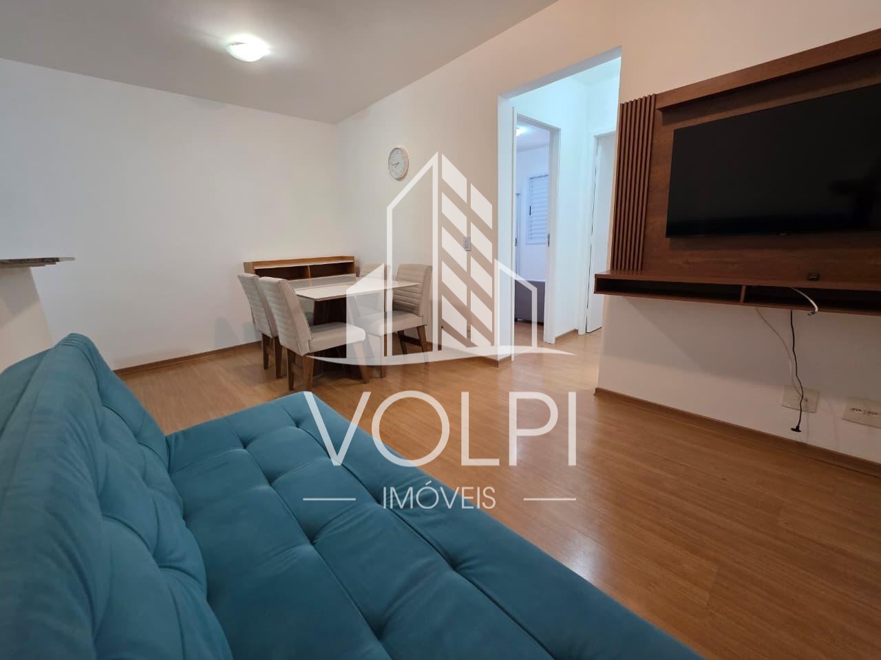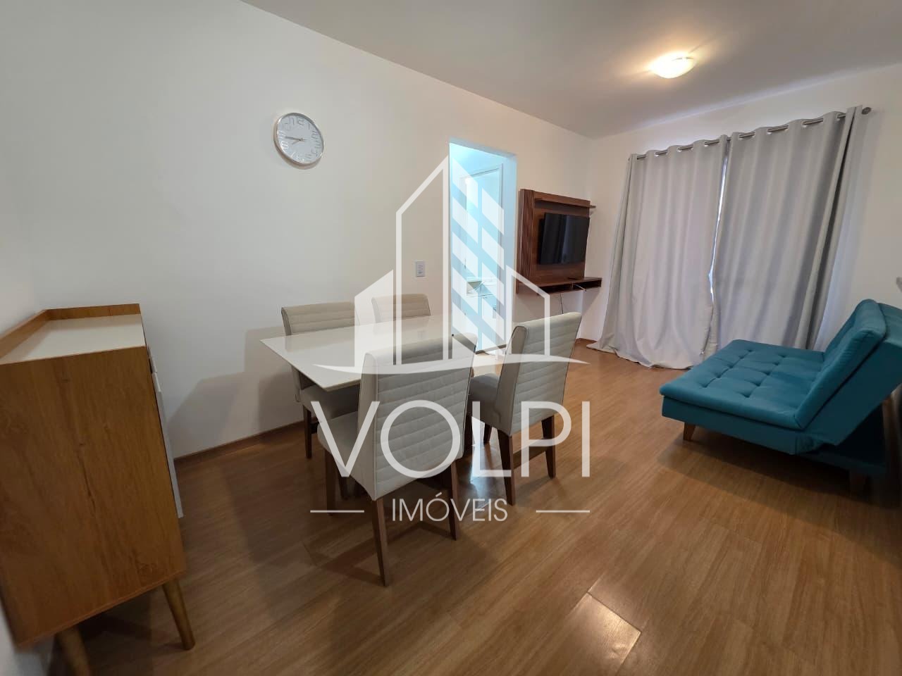 Ampla sala para 2 ambientes com Painel e cortina;